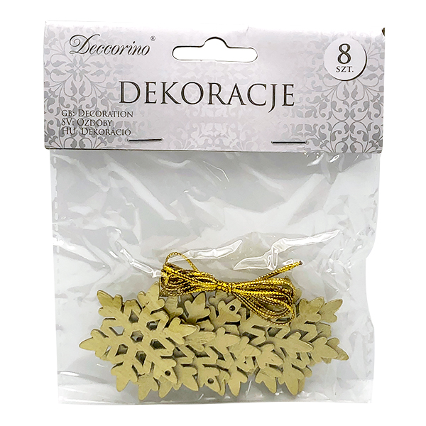 krásné dekorativní dřevěné lakované zlaté vločky, které mají 8ks provázků. Možno využít na zbobení vánočního věnce, stromku nebo jiné dekorace dle vlastní fantazie.